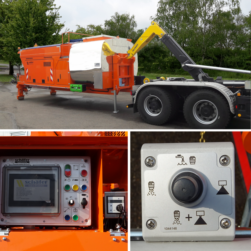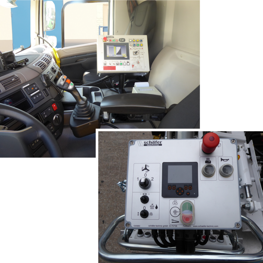A fin de aumentar la seguridad del personal de manejo, se puede instalar el brazo con cabezal mezclador delante del camión. En este caso, el usuario puede controlar y manejar el brazo de extensión cómodamente desde la cabina del conductor con un joystick.