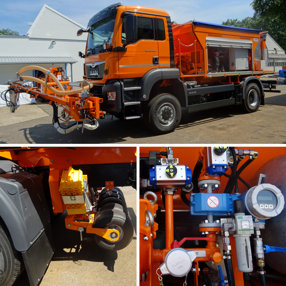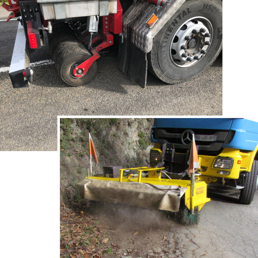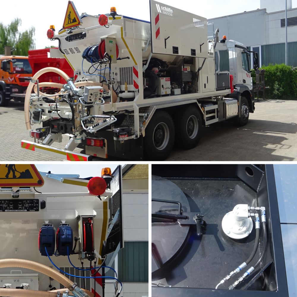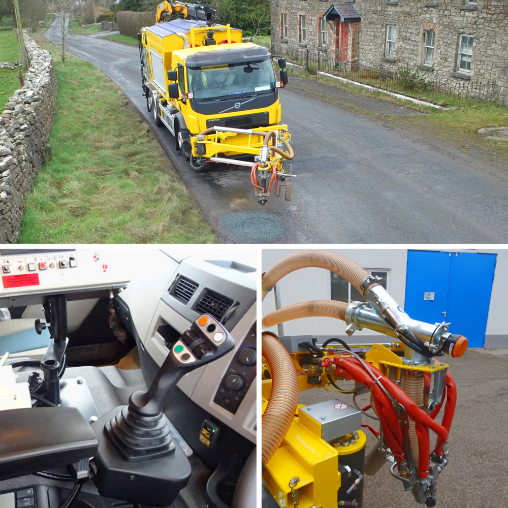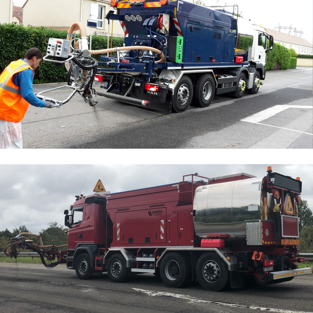 El brazo con cabezal mezclador constituye una herramienta ergonómica para la reparación de daños puntuales como baches. Esta máquina dispone de depósitos para gravilla, medio aglutinante, agua y aire, que se aplican a través del cabezal mezclador con dosificación computarizada.