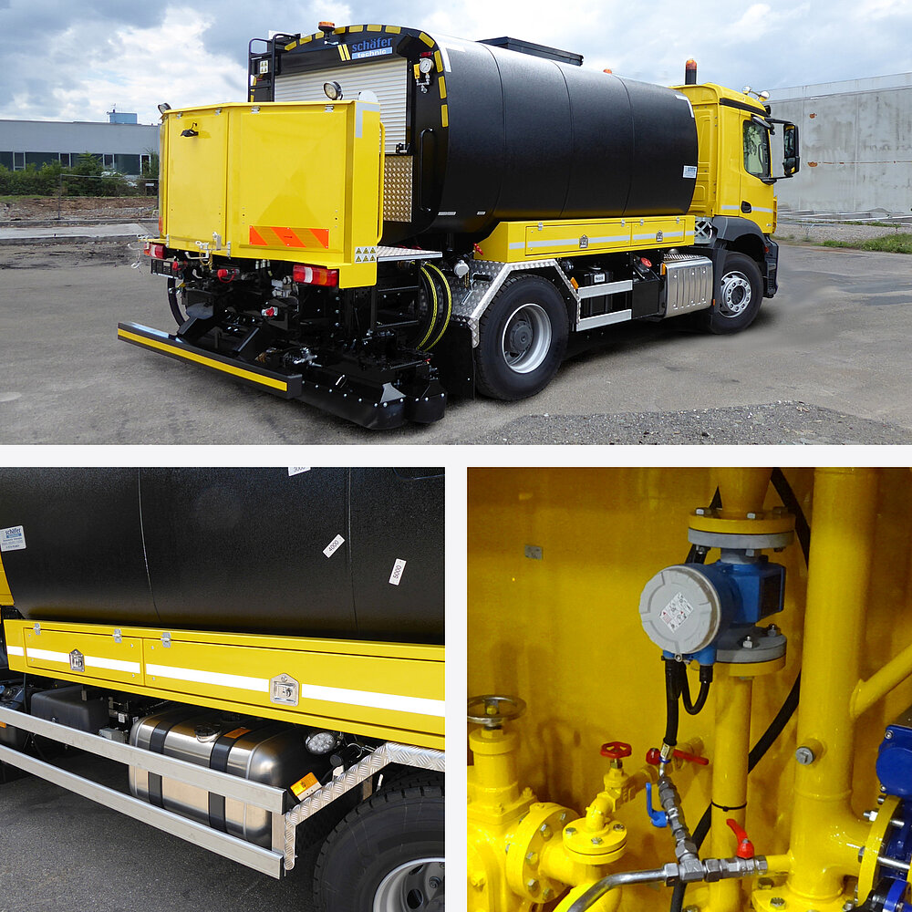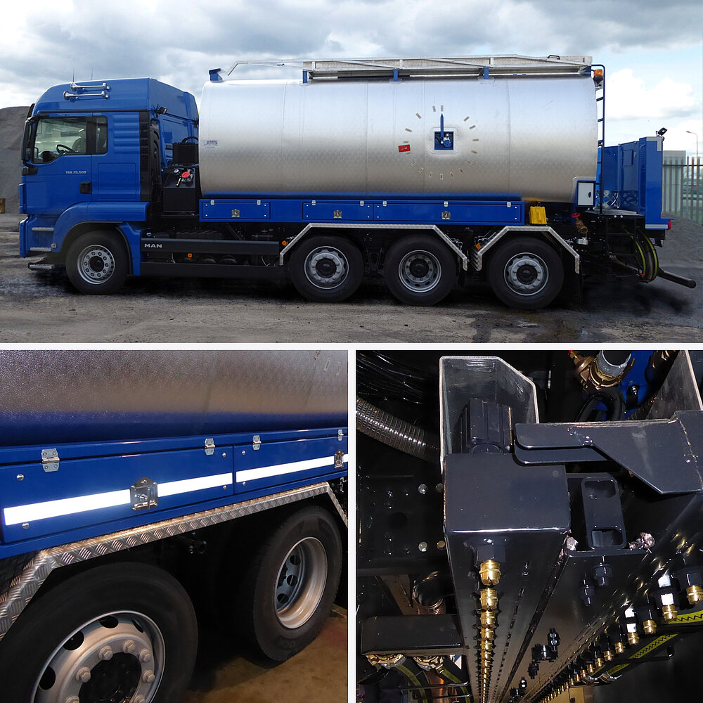 Il est possible de mettre en œuvre les liants routiers usuels tels que les émulsions de bitume, les bitumes ou les bitumes-polymères ainsi que des bitumes spéciaux. Les machines conformes à l'ADR peuvent transporter et mettre en œuvre des liants jusqu'à 200 °C.