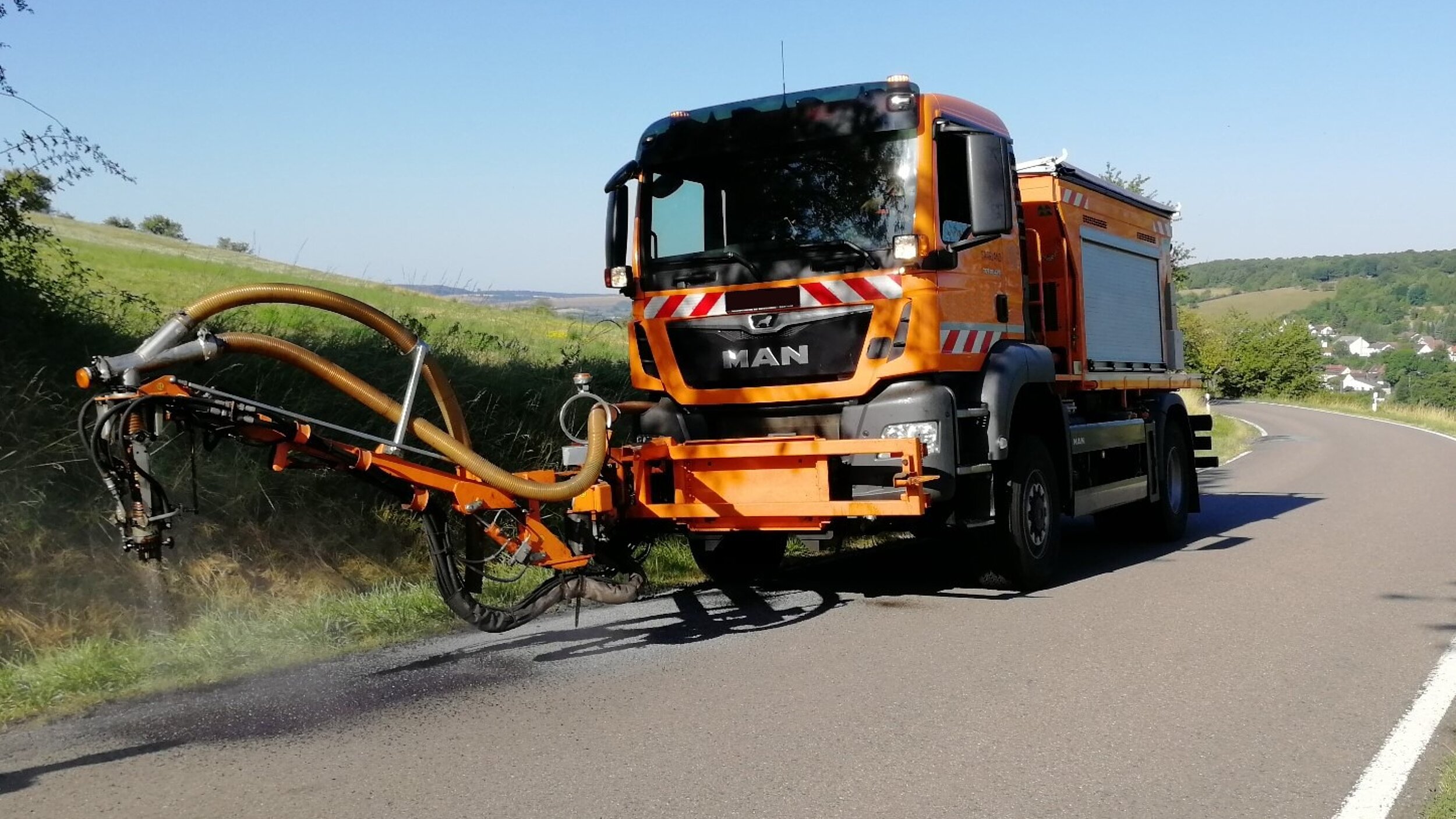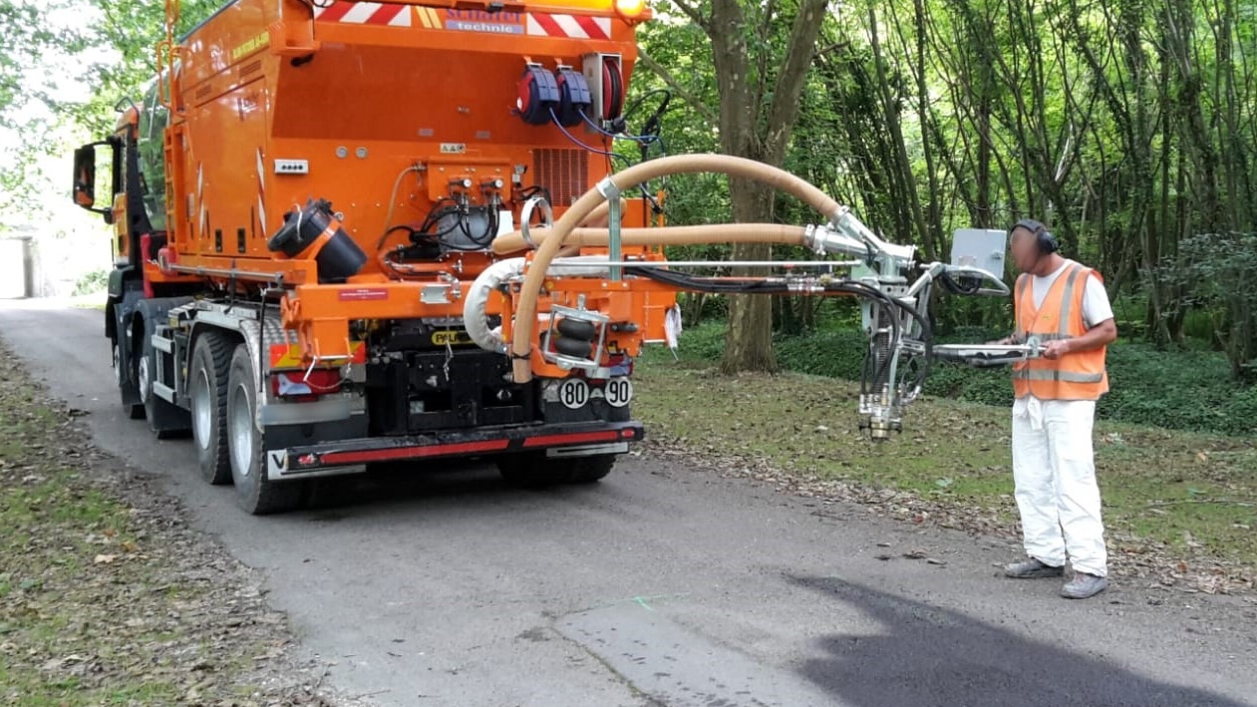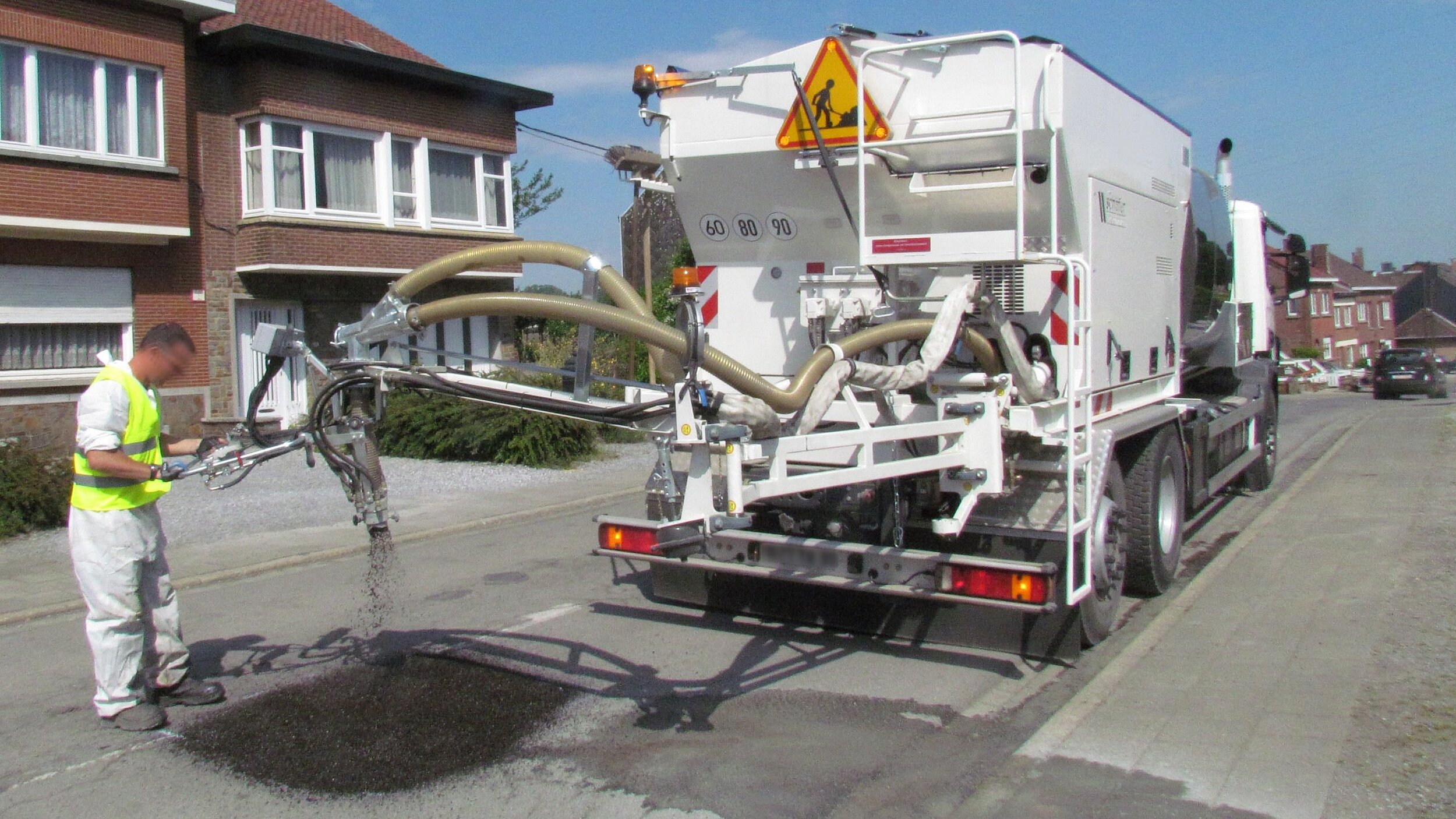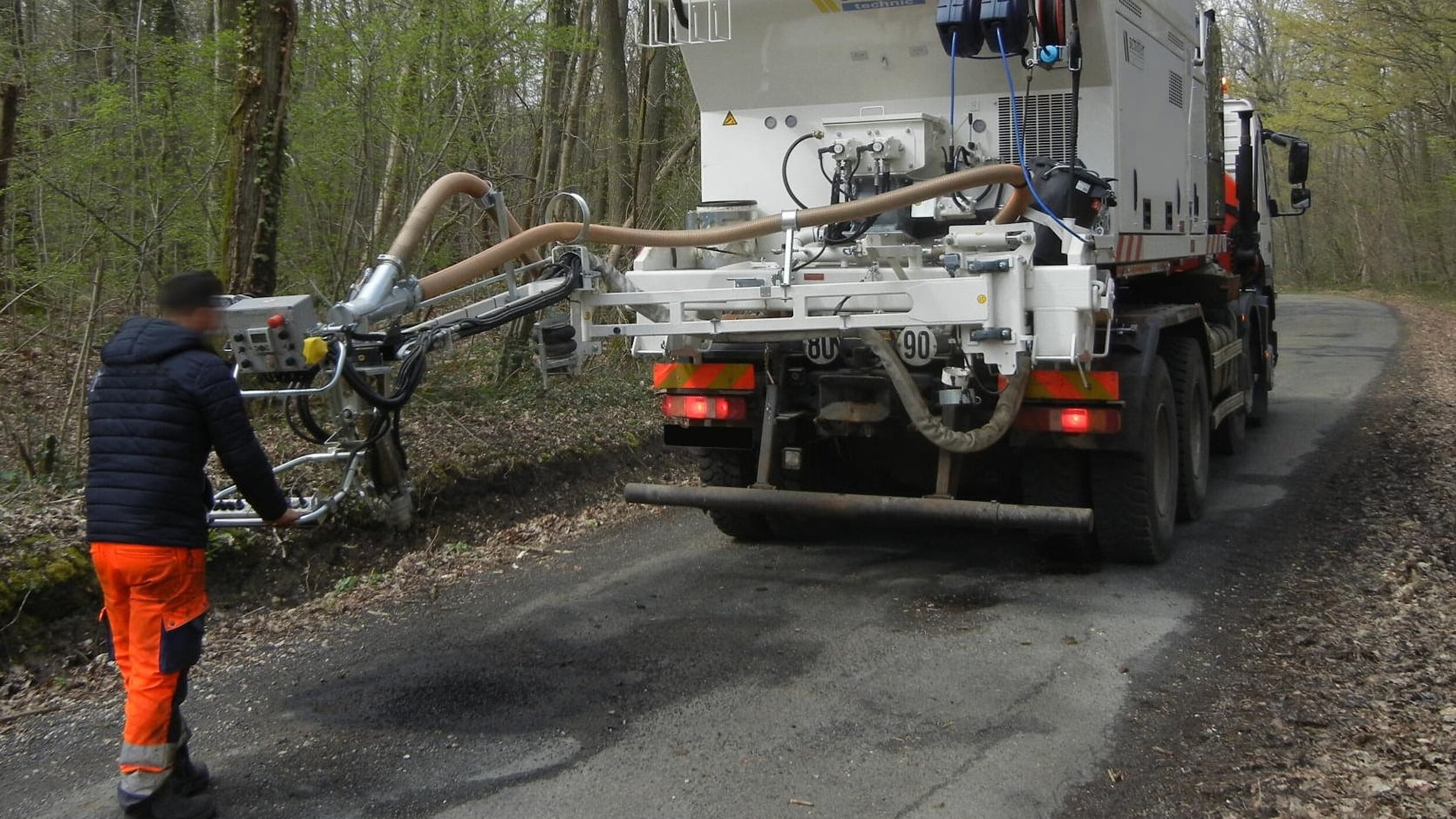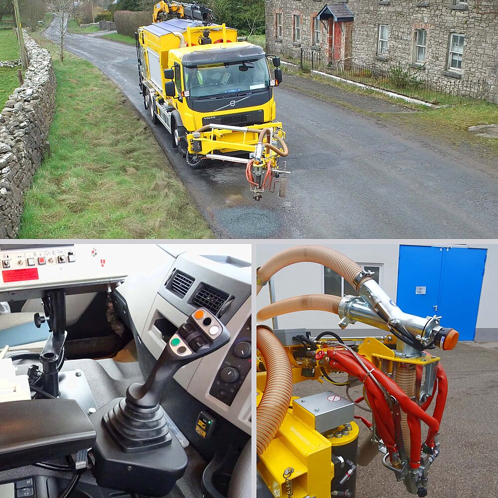 Der Arm mit Mischkopf bildet das ergonomische Werkzeug für die Behebung punktueller Schäden wie Schlaglöcher. Die Maschine verfügt über Reservoirs für Splitt, Bindemittel, Wasser und Luft, die computerdosiert über den Mischkopf eingesetzt werden.