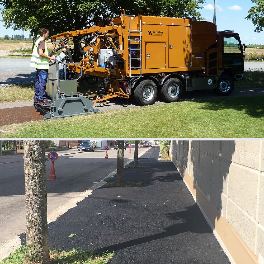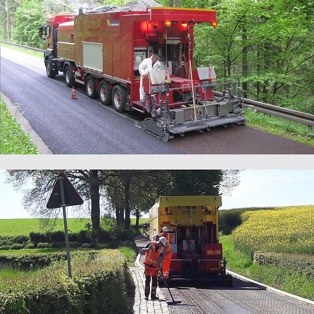 Für die Verwendung von DSK-Asphalt sprechen vor allem der geringe Primärenergiebedarf und die sich daraus ergebenden wirtschaftlichen Vorteile. Die Microbelag-Maschine vereint so ein mobiles Asphaltmischwerk und den Verleger auf der Baustelle.