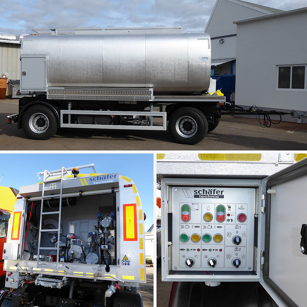 schäfer-technic ofrece la máquina adecuada en función del tamaño y los requisitos de la obra con las opciones de equipamiento más variadas. Además de las máquinas de rociado previo, para este tipo de procesos también están disponibles las máquinas SKS o una combinación de ambas. Los remolques cisterna para betún transportan y almacenan el aglutinante.