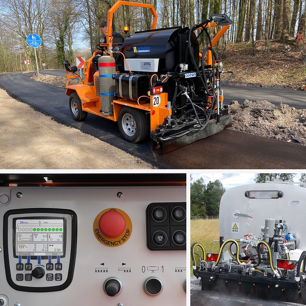 Die richtig dosierte Bindemittelmenge ist Voraussetzung für einen guten Schichtenverbund und eine lange Nutzungsdauer der Verkehrsfläche. Dosiersteuerungen aus dem Hause schäfer-technic regulieren zuverlässig, schnell und exakt.