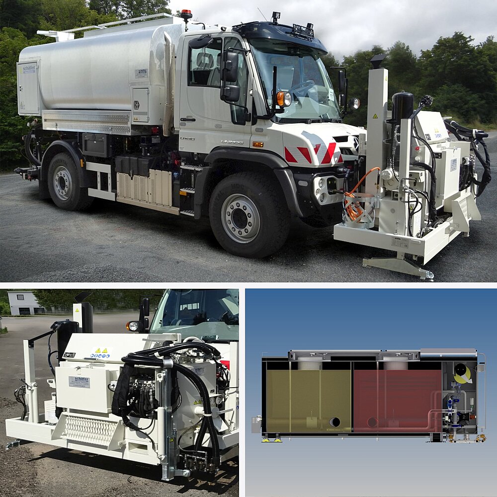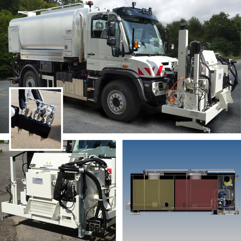 Nicht nur zusätzliche Aggregateräume oder Tanks für Kraftstoffe oder Dieselzusätze, eine Erweiterung für Brech-Additiv am Spritzbalken oder Frontanbauten z. B. für eine Kehrmaschine, machen die schäfer-technic BSM zu echten Allzweckwaffen auf Ihrer Baustelle.