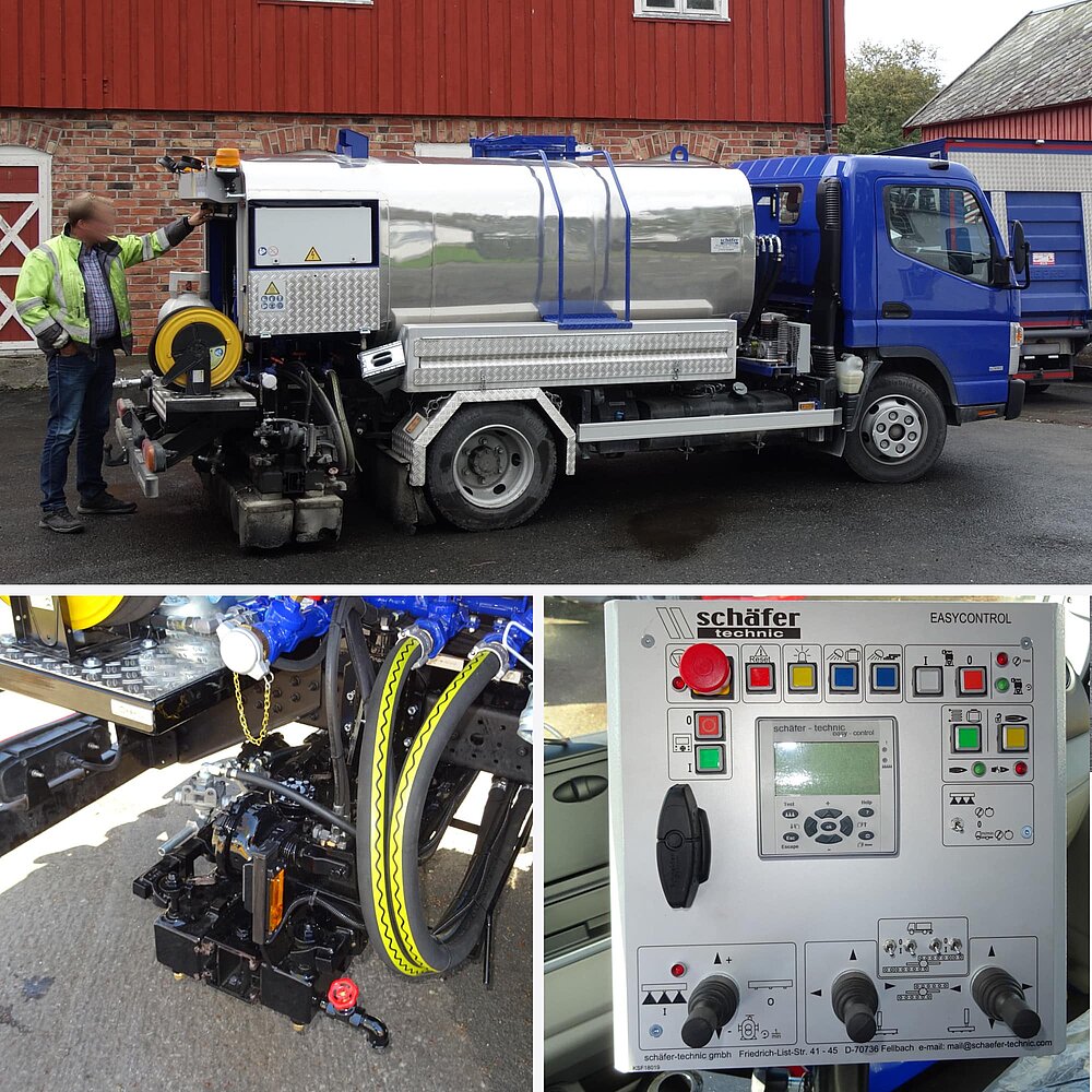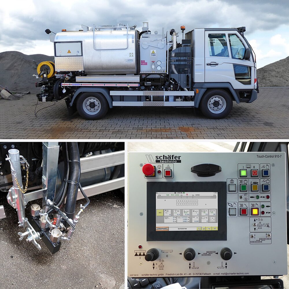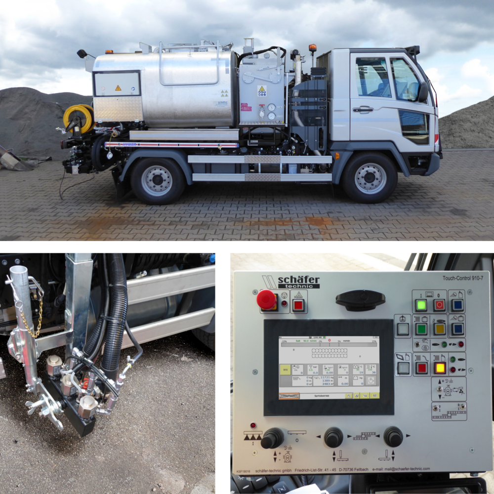 Die schäfer-technic Bitumenvorspritzmaschinen BSM transportieren, temperieren und verspritzen alle üblichen Straßenbau-Bitumenemulsionen, welche keiner Gefahrenklasse unterliegen.